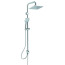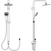 Duschsystem zur Kombination mit Aufputzarmaturen oder Wandanschlussbogen. Kopfbrause aus Metall 200 x 200 mm und 3-Funktionshandbrause 100 x 100 mm (Strahlarten: Regen, Platzregen und Massagestrahl). Anti-Kalk-Funktion. Wasserführende Brausestange mit schwenkbarem Druckknopf-Schieber. Brauseschlauch Idealflex 1750 mm. Verbindungsschlauch Idealflex 500 mm. Umschaltung integriert.